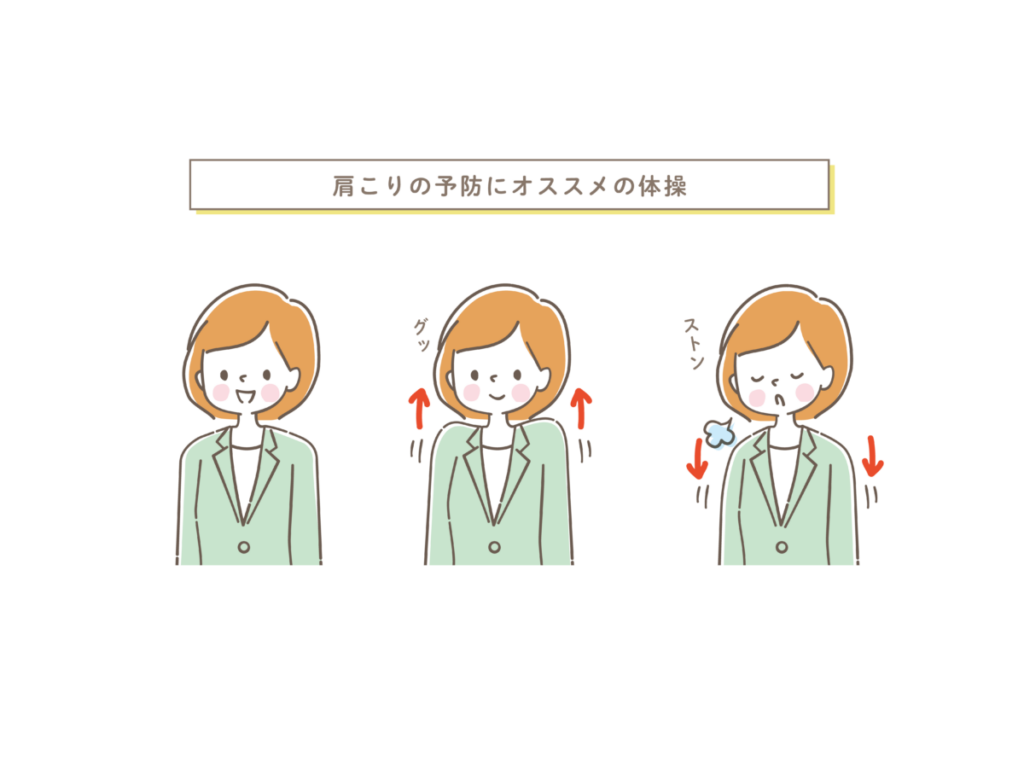 筋肉が柔らかくなっている為、無理なく伸ばすことができます。また仕事中に肩の重さを感じたら、1時間に1回は席を立って簡単なストレッチをすることをおすすめします。