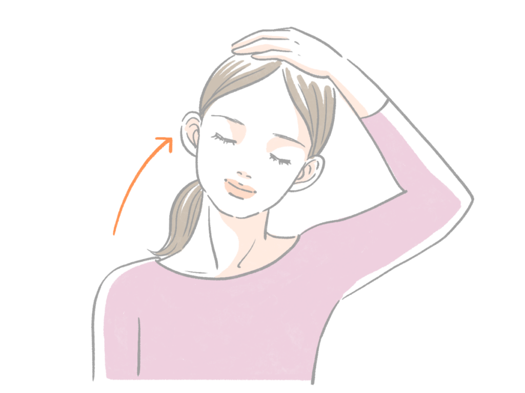 次に、首をゆっくりと右に傾けて10秒キープ、左も同様に行います。このとき、反対側の肩が上がらないように注意しましょう。