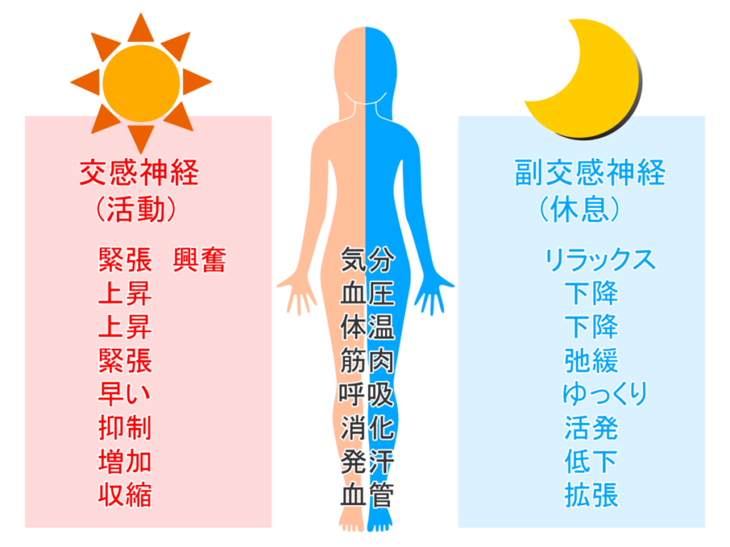自律神経は交感神経と副交感神経の二つから成り立っており、呼吸や心拍、消化、体温調節など、私たちが意識しなくても自動的に働いてくれる機能をコントロールしています。