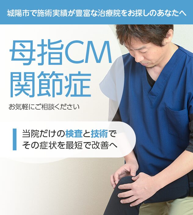 母指CM関節症は、親指の付け根にある関節に負担が重なり、痛みや腫れ、動かしづらさなどがみられる状態です。物をつまむ、握る、開けるなどの日常動作でつらさを感じやすく、親指が使いにくくなる場合もあります。